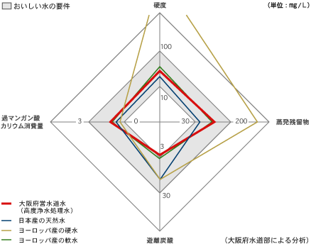| ■大阪府営水道では、平成10年7月より、高度浄水処理水(※)を全量供給しており、その水質は、厚生労働省の「おいしい水の要件」を満たし、市販のヨーロッパ産軟水のミネラルウォーターとほぼ同様です。